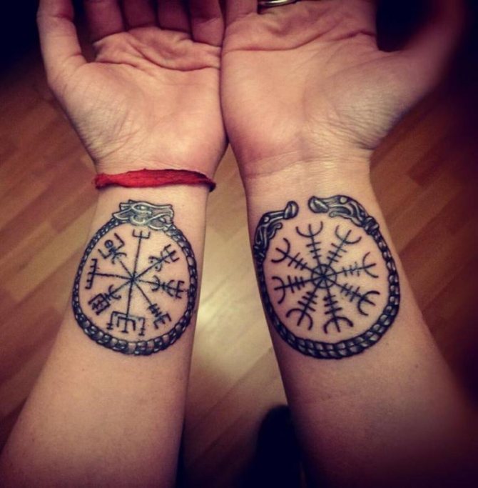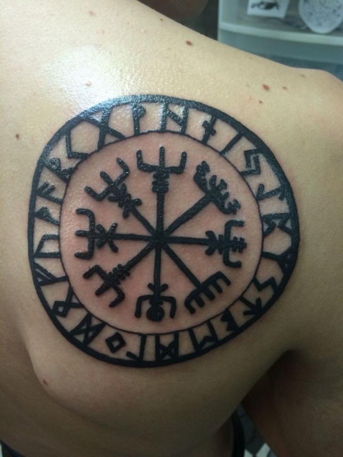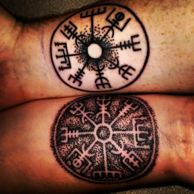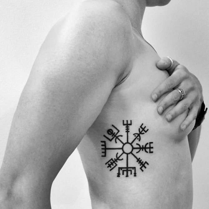 Der Runenkompass wird auch Vegvisir genannt. Es ist ein uraltes Symbol, das Reisende vor Unheil schützt, Glück bringt und die Gunst der Götter sichert. Das Tattoo ist für diejenigen geeignet, die oft auf Reisen und Geschäftsreisen sind. Die Tätowierung wird auch von Menschen getragen, die unsicher sind und Schwierigkeiten haben, Entscheidungen zu treffen.