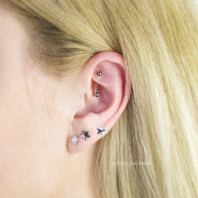 Ein Anfänger kommt schüchtern in den Salon und verliert sich in der Vielfalt, aber nach dem ersten Piercing wird er wahrscheinlich wiederkommen, weil er die Schönheit der Praxis versteht, den Charme der Piercings erfassen kann und tiefer in die Vielfalt der Piercings einsteigen will. Sie beginnen in der Regel mit dem Ohrläppchen. Eine Mutter kauft die ersten Ohrringe für ihre Tochter an deren fünftem Geburtstag oder sogar noch früher. Ein kurzer Moment des Unbehagens und die Ohrringe stecken in ihren Ohren. Hübsch, hübsch, und die kleine Fashionista ist glücklich und zufrieden. Dann kommt ihr der Gedanke, sich ein zweites Piercing im Ohrläppchen stechen zu lassen, in den Sinn. Heutzutage werden dafür keine Nadeln mehr verwendet. Das Piercing wird mit einer Pistole durchgeführt, die einem gewöhnlichen Tacker mit einem Ohrring anstelle einer Heftklammer ähnelt. Das zweite Piercing ist mit einem interessanteren Ohrring verziert. Die Anzahl der Piercings in einem Ohr ist nur durch die Phantasie und das Augenmaß des Trägers begrenzt. Aber früher oder später kommt man auf die Idee, den Ohrknorpel zu piercen. Fotos des Verfahrens und des Ergebnisses sind in der Mappe der Meister des Salons zu sehen, bei dem sich der Kunde anmeldet. Das Verfahren wird auch als Ohrknorpelpiercing oder Helixpiercing bezeichnet. Die Manipulation kann schmerzhaft sein und der Knorpel braucht lange, um zu heilen, aber das Ergebnis sieht sehr schön und originell aus.