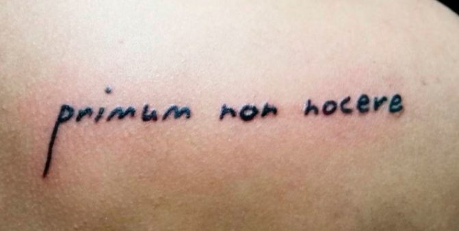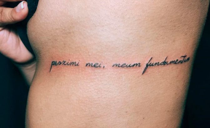 Meistens wird die Inschrift in lateinischer Sprache dargestellt. Die Tätowierung kann auch eine Vielzahl von Bestandteilen enthalten. Zum Beispiel Blumen, Herzen oder Tauben.