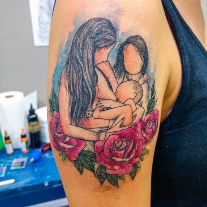 - Porträt einer Mutter. Ein solches Tattoo zu machen, macht Menschen Mut, die eine unsichtbare Verbindung mit der Mutter fühlen. Die Person ist in der Regel kreativ und charismatisch.