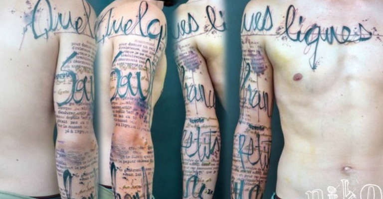 Bei den Ärmeln handelt es sich um Tätowierungen, die den gesamten Arm der Länge nach bedecken, so dass zusätzlich zur Inschrift eine ganze Komposition entsteht. Die Botschaft des Bildes und die Inschrift auf dem Arm sollten miteinander verwoben sein.