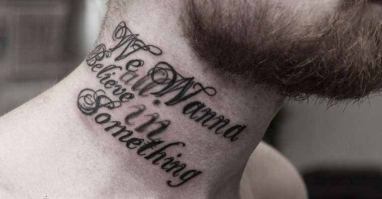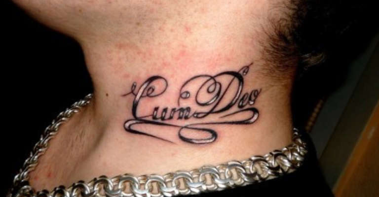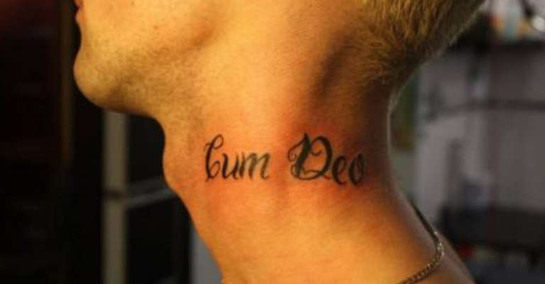 Eine Tätowierung mit lateinischer Inschrift kann sich am Hals befinden, wenn ein Mann mit dieser Art von Körperkunst eine Veränderung und ein neues Leben anstrebt.