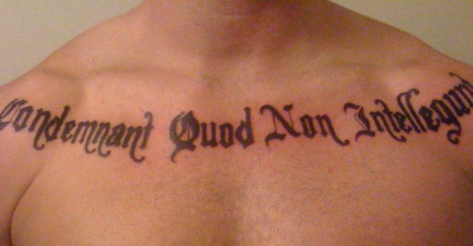 Ein sehr interessantes Beispiel, das für andere nicht so klar ist, ist die gleiche Inschrift, aber in Latein: "Deus solus me iudicare potest". Die Bedeutung dieser Tätowierung bleibt dieselbe, aber nicht jeder wird sie sofort verstehen, nachdem er sie auf seiner Haut gelesen hat.