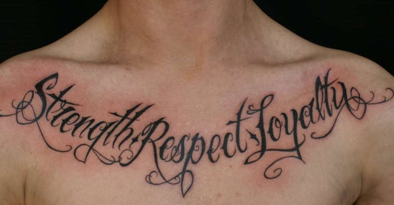 Originell und schön ist die Anordnung der Buchstaben in einem Halbkreis am Schlüsselbein. Kompakte Zusammensetzungen werden zum Nähen über dem Schlüsselbein oder den Rippen verwendet. Im Rückenbereich ist der Schriftzug quer über den Schultergürtel angebracht. Eine kleine Bogen-Tätowierung wird auf den aufgepumpten Muskel aufgetragen.