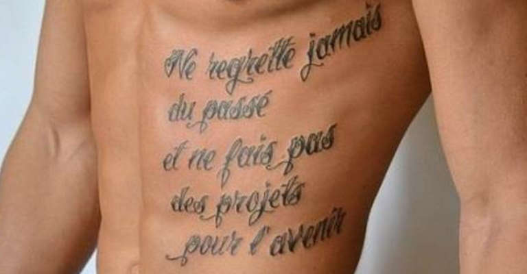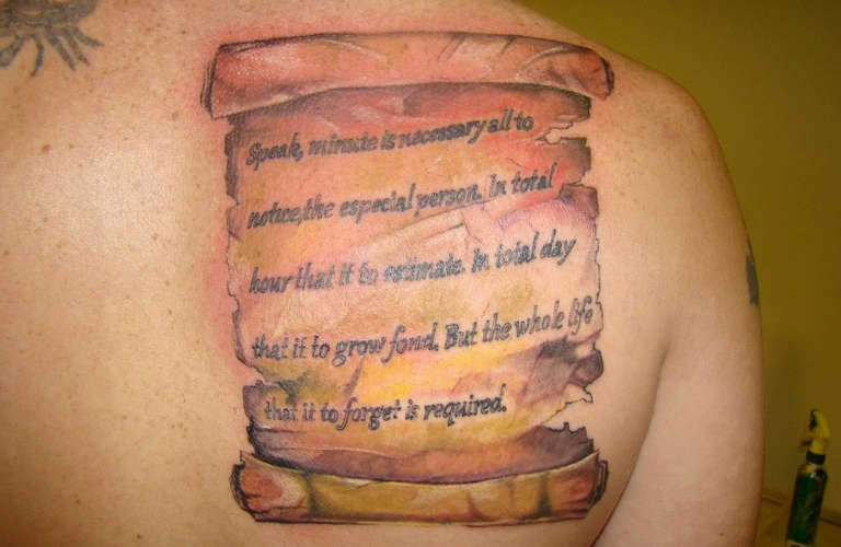 Dieser Bereich eignet sich für die Tätowierung langer Phrasen in großem Umfang. Daher kann die Inschrift in Form eines Zitats, eines philosophischen Spruchs, religiöser Ansichten und Vorurteile sein.