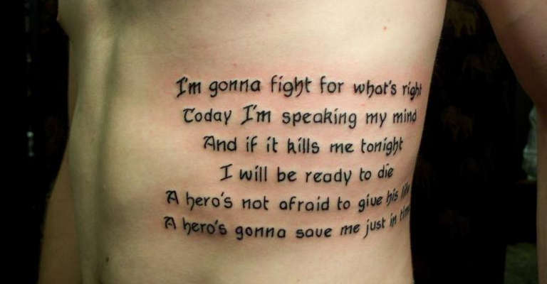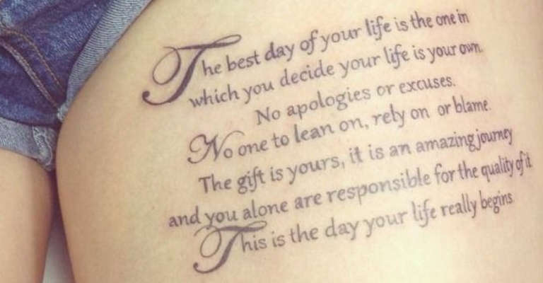 Die Auswahl eines Textes für die Tätowierung ist nicht so einfach, wie es auf den ersten Blick scheinen mag. Am häufigsten werden Zitate berühmter Personen, Filmausschnitte oder Sprüche von Prominenten gewählt. Eine interessante Idee könnte ein Lieblingsspruch eines Familienmitglieds oder eines Freundes sein, oder ein Motto für Ihr Leben, eine Botschaft an Sie selbst, eine Erinnerung an etwas Wichtiges oder motivierende Worte, die Ihnen in einer schwierigen Zeit Ihres Lebens Vertrauen und Unterstützung geben.