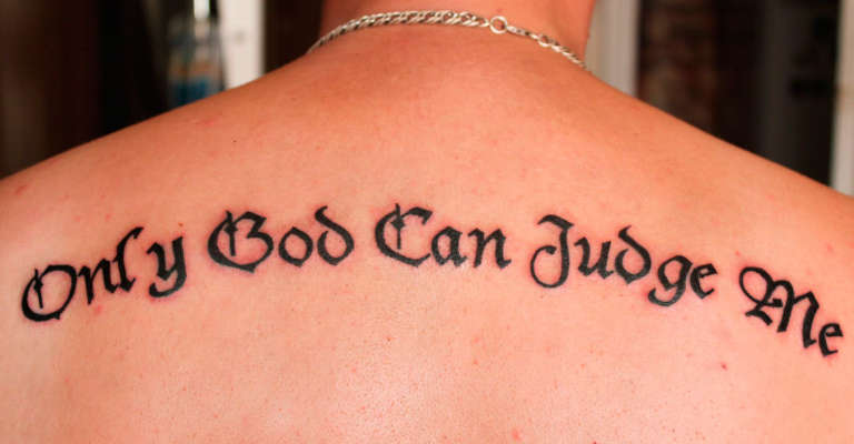 Auch wenn die religiöse Welt gemischt auf Tattoos reagiert, war und ist die religiöse Körperkunst immer in Mode. Wenn es um diese Tätowierungen in Form von Inschriften geht, ist die beliebteste: "Gott ist mein Richter", oder in der englischen Variante: "Nur Gott kann mich richten". Die Bedeutung der Tätowierung "Gott ist mein Richter" ist offensichtlich, aber auch vielschichtig.