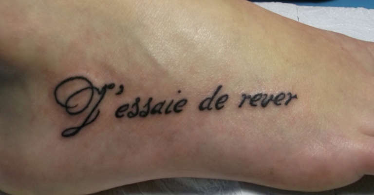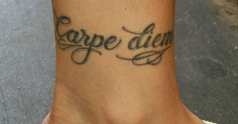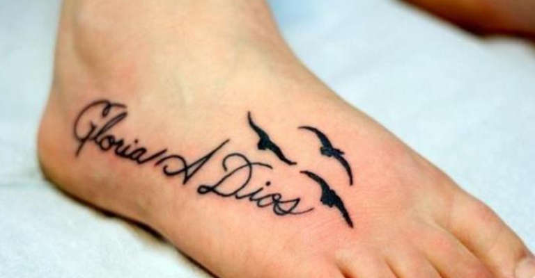 An den Füßen können lateinische Tattoos auf Motivation und Vorwärtsbewegung hinweisen, daher wird hier ein Text angebracht, der Kraft, Glück und Entschlossenheit verleiht. Religiöse Tätowierungen an den Füßen sind selten abgebildet.
