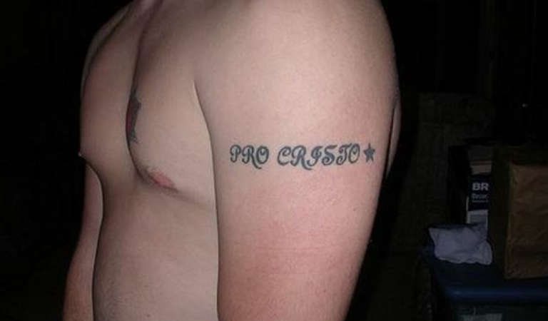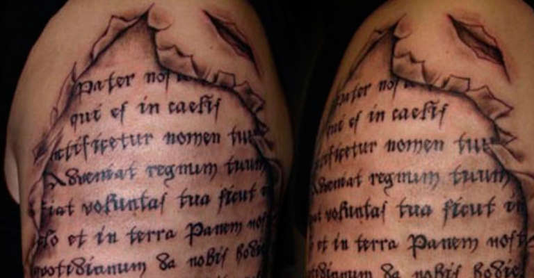 Auf den Schultern kann ein Mann beliebige lateinische Sätze und Zitate über den Glauben, die Liebe und die Familie anbringen.
