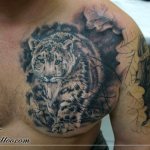 Die Zahl der Tattoo-Optionen mit dem Bild eines Leoparden auf zählt heute eine große Anzahl von Ideen, dank derer jeder, der seinen Körper mit einer solchen Skizze schmücken möchte, wählt leicht für sich selbst die beste Option. Für Männer könnte das Leopardenmuster auf der Schulter oder der Brust ein Zeichen für Mut und Selbstvertrauen sein. Die "Männer"-Designs zeichnen sich durch die Schärfe des Bildes aus. Oft bereitet sich das Raubtier am Körper eines Mannes darauf vor, zu springen oder sein Grinsen zu zeigen.