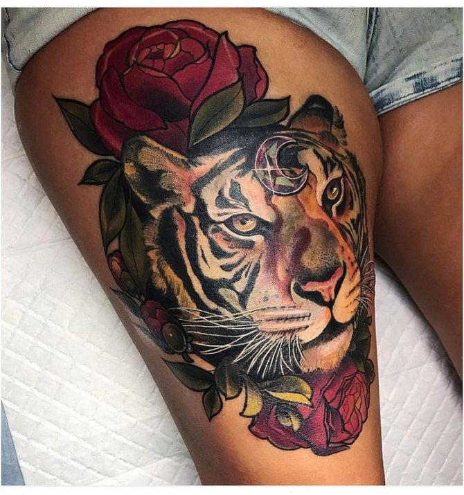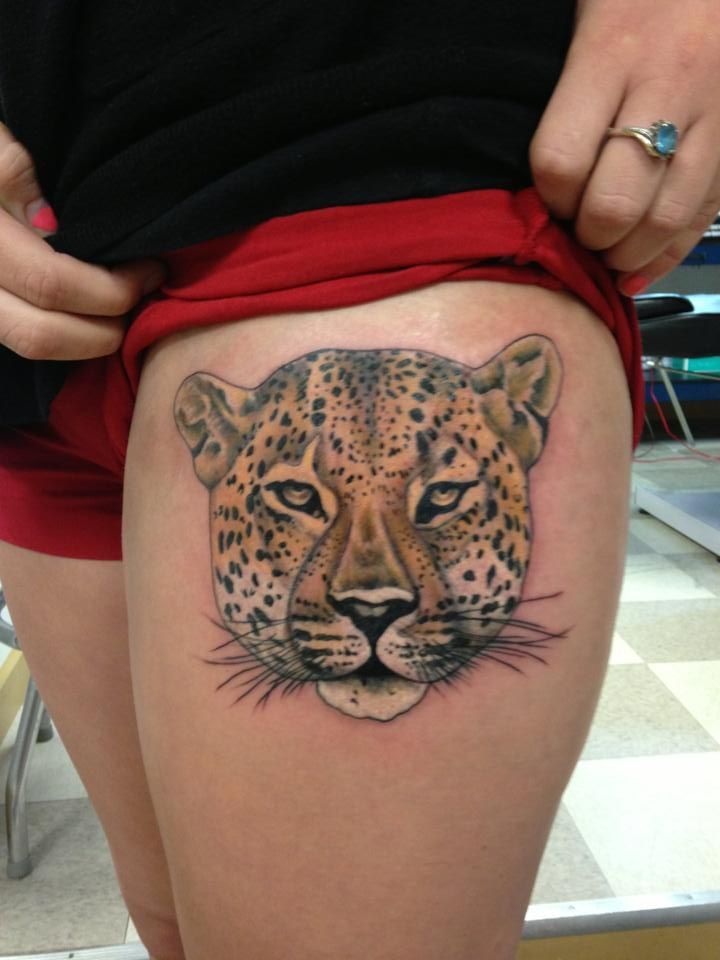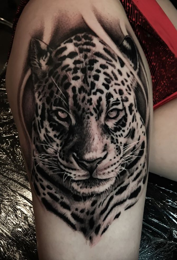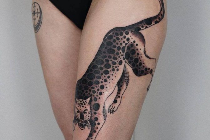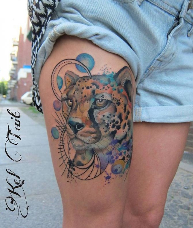 - Die Position der Tätowierung auf dem Bein kann vorne, an der Seite oder auf dem Rücken sein. Ein Leoparden-Tattoo in Bewegung, diagonal von der Hüfte bis zum Knie platziert, sieht wunderschön aus.