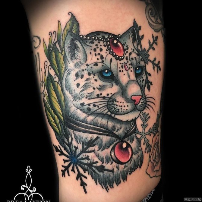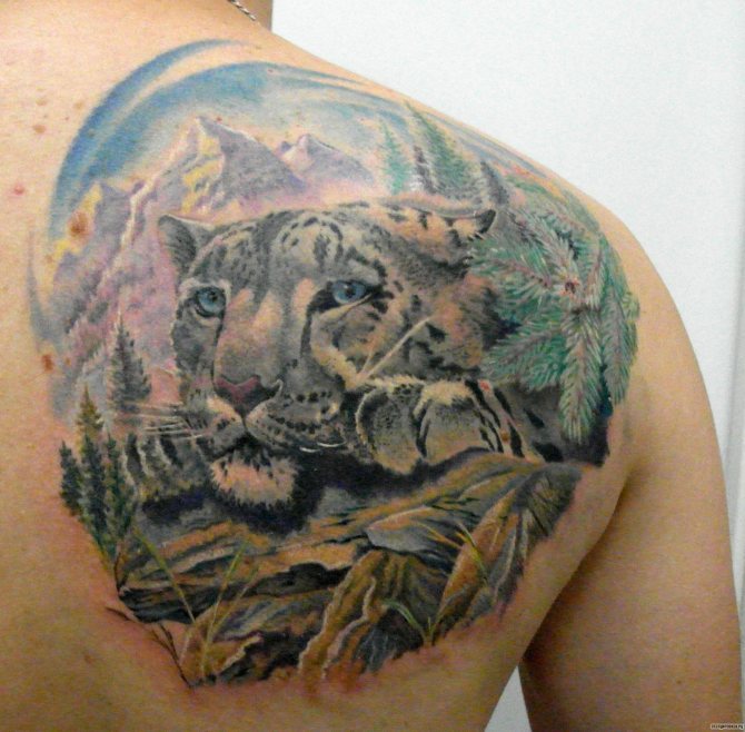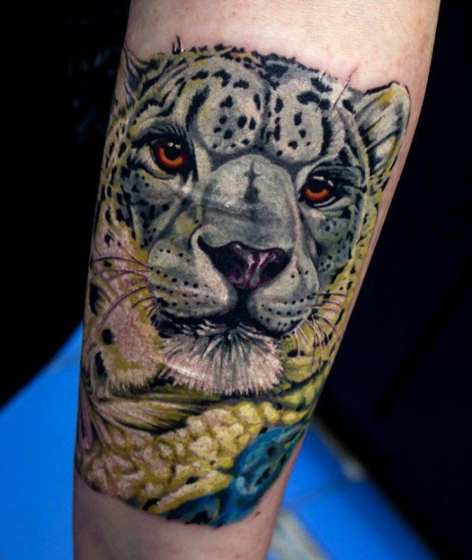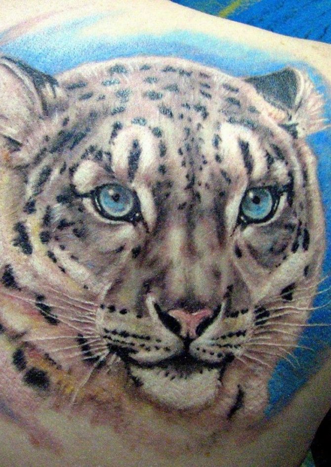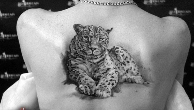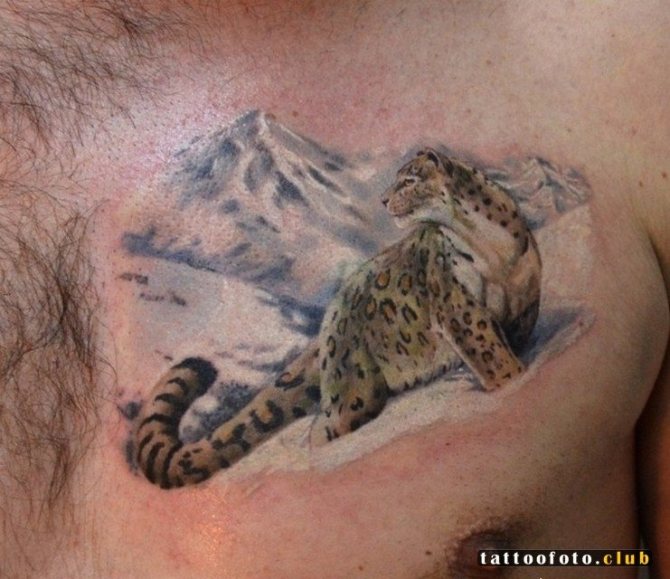 Viele Menschen malen sich den Leoparden auf den Körper, als Geste des Respekts und als Zeichen der Notwendigkeit, diese gefährdete Art zu erhalten. Das Bild dieses Tieres ist auch sehr beliebt bei Menschen, die in den Bergen arbeiten, wie Forscher, Bergsteiger oder Reisende. Für viele von ihnen ist der Leopard ein Totemtier, und sein Bild ist eine Art Talisman, der zur erfolgreichen Bewältigung der Aufgabe beiträgt.