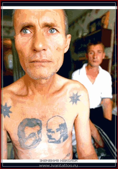 Tätowierung Lenin und Stalin auf der Brust als Schutz gegen die Kugel der Tschekisten dienen. Die Banditen in der UdSSR glaubten, dass die Tschekisten nicht auf das Bild der Führer schießen würden. Jetzt wird es von normalen Menschen zum Spaß tätowiert.