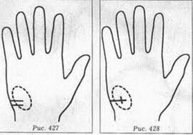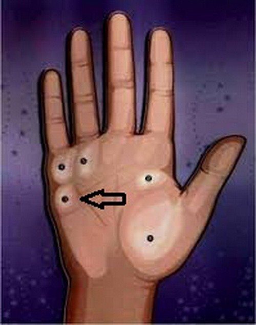 Es gibt zwei Marshöcker, der größere befindet sich unterhalb des Merkurhöckers und der kleinere zwischen Zeigefinger und Daumen. Jeder kreuzförmige Fleck auf diesem Teil der Handfläche ist negativ.