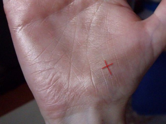 | Deutliches kleines Kreuz in der Mitte des Hügels. | Gefahr durch Wasser, Tod durch Ertrinken. | Seien Sie in der Nähe von Gewässern vorsichtig, bis der Fleck auf der Handfläche verschwindet. |