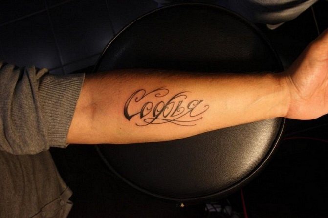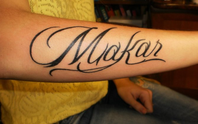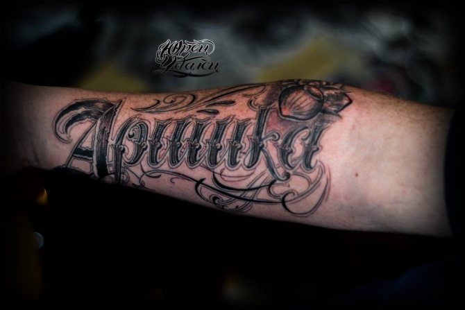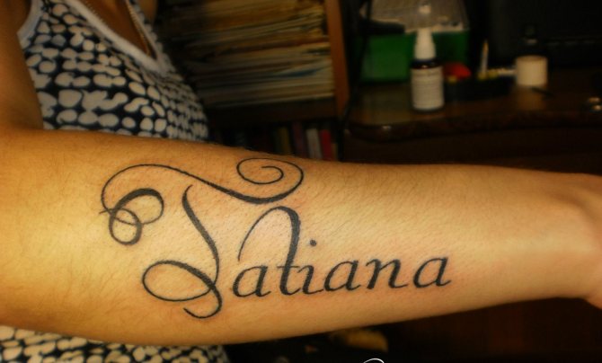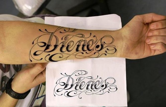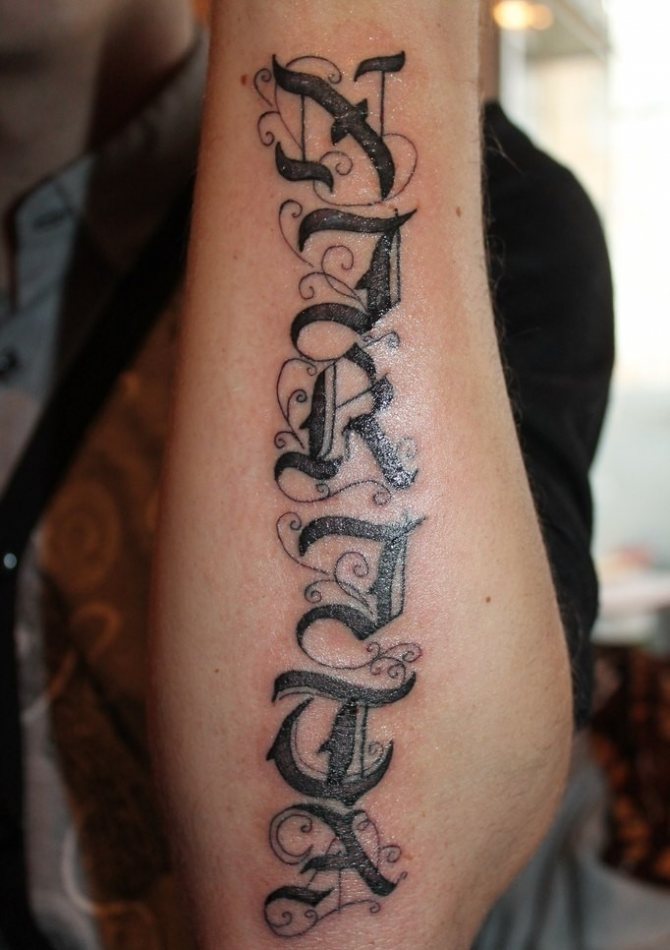 Tätowierungen dieser Art können als eigenständiges Design oder als Teil einer Komposition verwendet werden. Wenn großformatige Bilder nicht nach Ihrem Geschmack sind, ist es wichtig, die richtige Schriftart zu wählen, damit das Tattoo anspruchsvoll und interessant aussieht. Es gibt eine Fülle von Schriftarten, so dass es ganz auf die persönlichen Vorlieben ankommt. Für Mädchen ist ein Schreibstil mit fließenden, subtilen, abgerundeten Linien am besten geeignet. Dies unterstreicht die Zartheit, Zerbrechlichkeit und den Charme der Trägerin. Für Männer ist eine rauere, festere Schrift typisch. Oft werden Namen in verschiedene Sprachen übersetzt, z. B. ins Lateinische, Chinesische oder Englische. Auf diese Weise wird die Tätowierung ungewöhnlich und attraktiv aussehen.