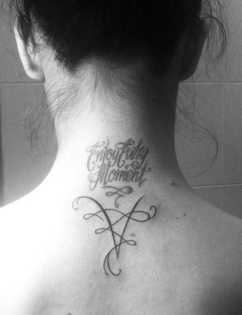 Auf dem Hals der berühmten Sängerin Victoria Daineko steht der Satz Enjoy Every Moment", was übersetzt so viel bedeutet wie Genieße jeden Moment". Diese Tätowierung ist auf Englisch und erinnert an ihre verlorene Liebe. Das Mädchen selbst konnte sich lange Zeit nicht für ein passendes Design entscheiden. Ein Handwerker kam ihr zu Hilfe und schlug ihr vor, einen Spruch auf ihren Hals zu schreiben.