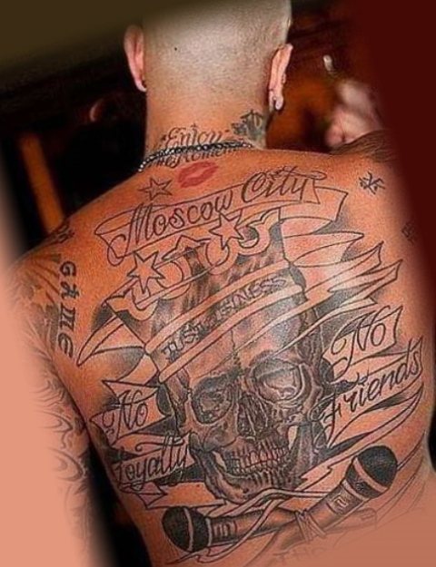 Der russische Rapper Timati trägt das Bild eines Totenkopfes auf dem Rücken. Es ist das größte Tattoo, das der Rapper je hatte. Der Totenkopf steht für Gefahr, Tod und das Bewusstsein für die Vergänglichkeit der Zeit. Timatis Tätowierung in Form der Aufschrift "The Boss" auf seiner Hüfte weist wahrscheinlich auf seine Position im Team hin und unterstreicht die Führungsqualitäten des Sängers.