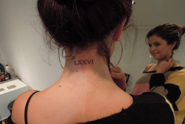 Auf dem Hals der berühmten Schauspielerin Selena Gomez tätowiert römischen Ziffern, die mit dem Geburtsdatum der Mutter des Mädchens übereinstimmen. Später ließ das Mädchen die arabische Inschrift unter ihrem rechten Schulterblatt anbringen, die übersetzt "Ich liebe mich selbst zuerst" bedeutet.
