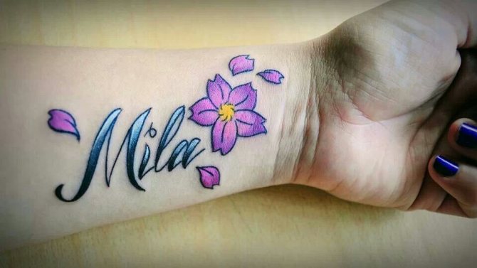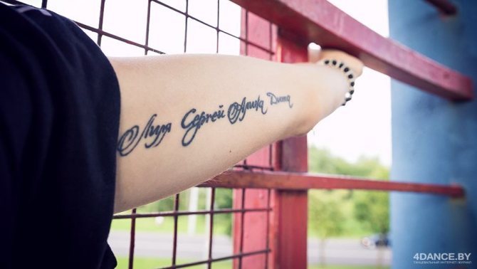 Von besonderer Bedeutung unter den Tattoos mit den Namen sind gepaarte Designs. Diese Variante der Skizzen wird sehr oft von Ehepartnern bevorzugt. Manchmal tauschen Paare nicht nur Ringe aus, sondern tätowieren sich auch die Namen der anderen. Eine solche Zeichnung kann von einem schönen Zitat oder einem bedeutenden Datum begleitet werden. In der Regel stehen die Namen an der gleichen Stelle. Eine gute Möglichkeit wäre, den Namen des Ehepartners anstelle des Eherings auf den Ringfinger zu setzen. Es ist sehr üblich, den Namen des Kindes auf ein Bild zu schreiben. Um es originell zu gestalten, fügen Eltern die Flügel eines Engels, eine Krone oder den Umriss einer Babyhand hinzu.