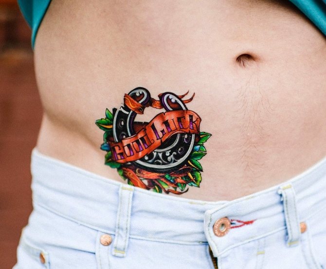 Die abgerundete, bogenförmige Form des Zeichens steht im Einklang mit dem Kreis - traditionell ein weibliches Bild, daher ist das Hufeisen ein sehr häufig gewähltes Motiv für Tätowierungen von Mädchen. Das klassische Design, das durch farbenfrohe Blumen- und Blattmotive ergänzt wird, soll die Sanftheit, Geduld und Ausdauer der Trägerin zum Ausdruck bringen. Diese Eigenschaften sind der Schlüssel zu einem glücklichen Familienleben, zum Glück und zur Gesundheit einer Frau, die schöne Kinder zur Welt bringen kann.