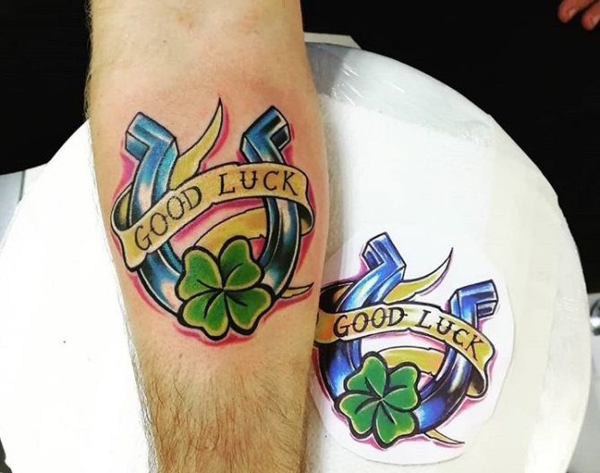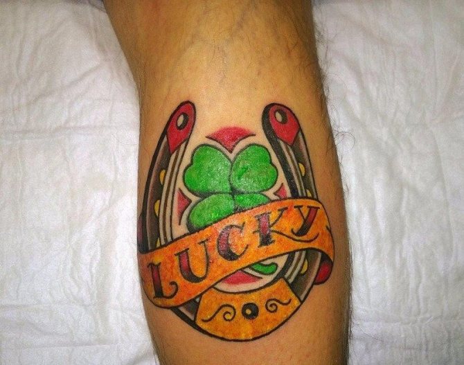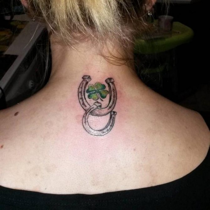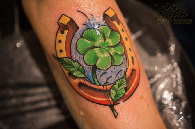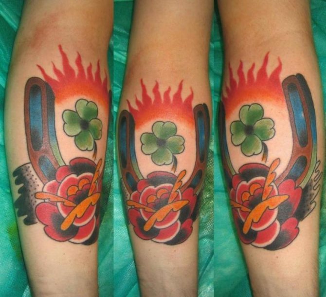Um die Wirkung des Glückszeichens zu verstärken, versucht man, mehrere Glücksbilder in einer Figur zu vereinen. Die Tätowierung eines Hufeisens mit einem vierblättrigen Kleeblatt ist ein superstarkes Symbol, das das Glück nicht nur in einem Lebensbereich anziehen soll, sondern gleich aus mehreren Richtungen. Die Blume mit ihren vier ineinander verschlungenen Blättern gilt in vielen Ländern als die Einheit der vier Elemente: Erde, Wasser, Luft und Feuer. Das vierblättrige Kleeblatt ist ein Symbol für die Einheit der vier Elemente Erde, Wasser, Luft und Feuer und für die Kraft der Hexerei, die dem Kind nicht nur sagenhaftes Glück, sondern auch Gesundheit, Ausdauer und Charme verleiht.