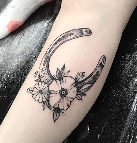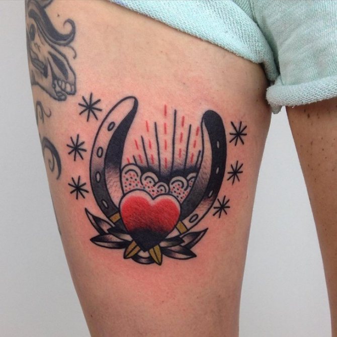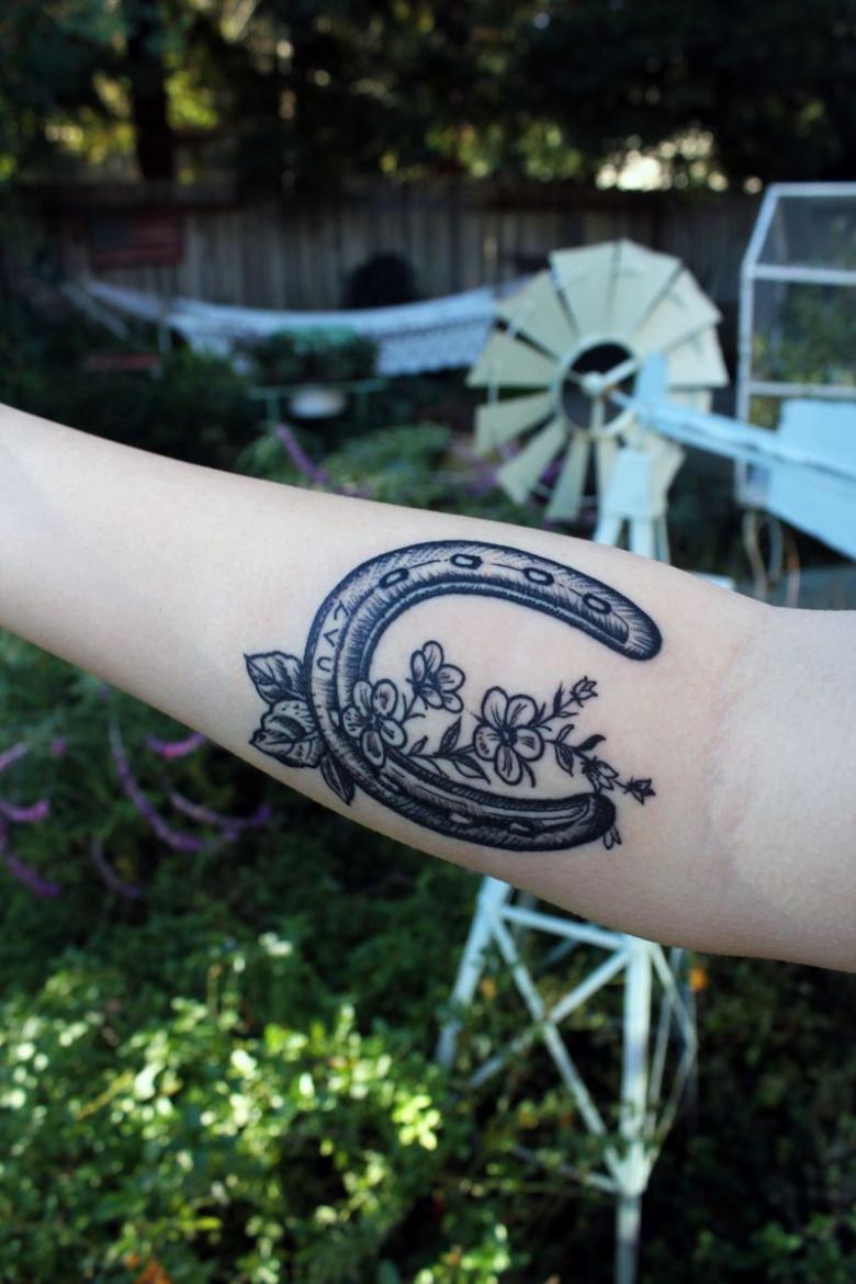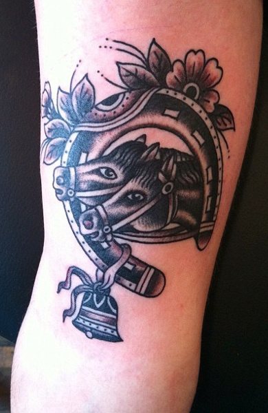 Das Bild eines Hufeisens wurde im alten Rom als Glückssymbol verwendet, als der bogenförmige Metallstreifen zum Schutz der Pferdehufe noch nicht erfunden war, um Nägel zu befestigen. Die adligen Reichen schmückten das Pferdegeschirr oft mit Juwelen, und die Hufeisen waren aus Gold. Der glückliche Bauer, der nach einem Umzug einen Schuh im Staub der Straße fand, hatte oft das Glück, einen Schuh mit Gold zu finden, weshalb dieses Muster als Glücksbringer verwendet wurde. Für moderne Tätowierer ist das Hufeisen nicht nur ein Glückssymbol, sondern auch ein persönlicher Talisman, der vor bösen Geistern schützt und für Wohlstand in allen Lebensbereichen sorgt.