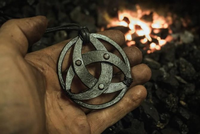 . Dieses Zeichen wurde auf Kleidung und Waffen, Haushaltsgegenständen und Schmuck angebracht. Amulett trickvetr im Herzen gehalten - auf der Brust oder Hals.