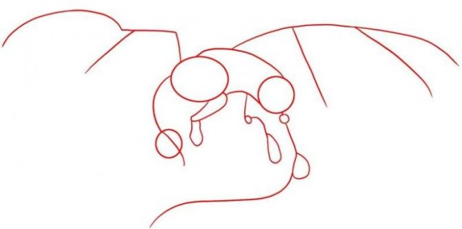 - Ensuite, au niveau du corps, vous devez dessiner deux lignes brisées, qui seront les ailes.