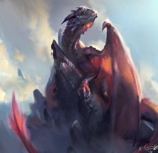 En revanche, on peut imaginer un dragon énorme et puissant qui a traversé de nombreuses guerres et batailles. Son corps porte d'innombrables cicatrices de combat. Le fond autour du reptile est sombre, avec des teintes brun rougeâtre. Le dragon sur la toile est de grande taille, majestueux, intimidant.
