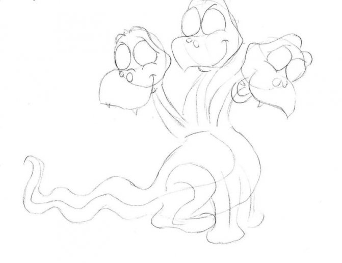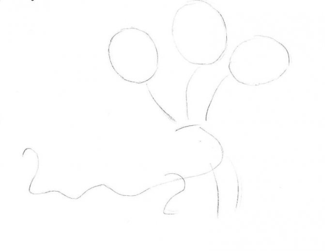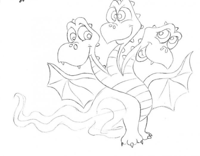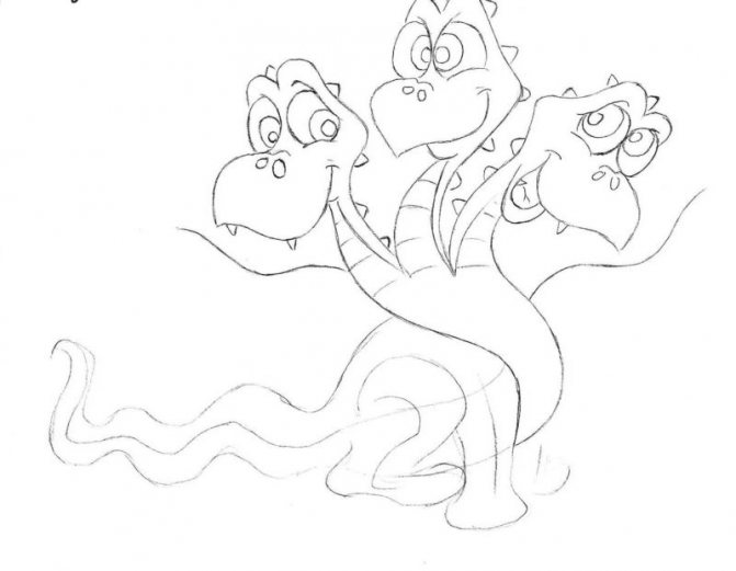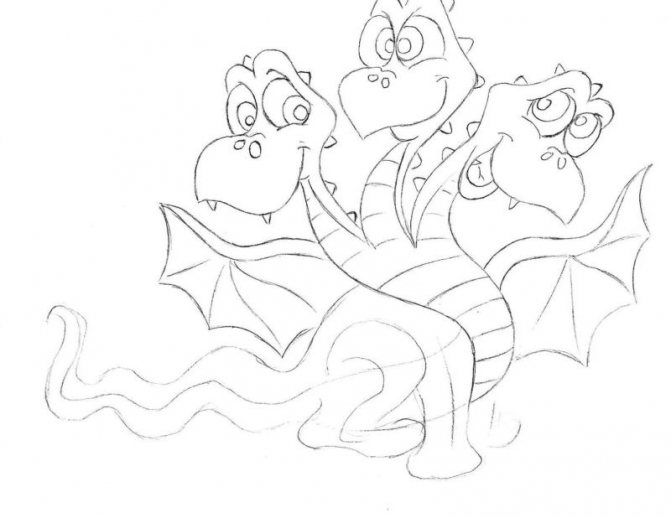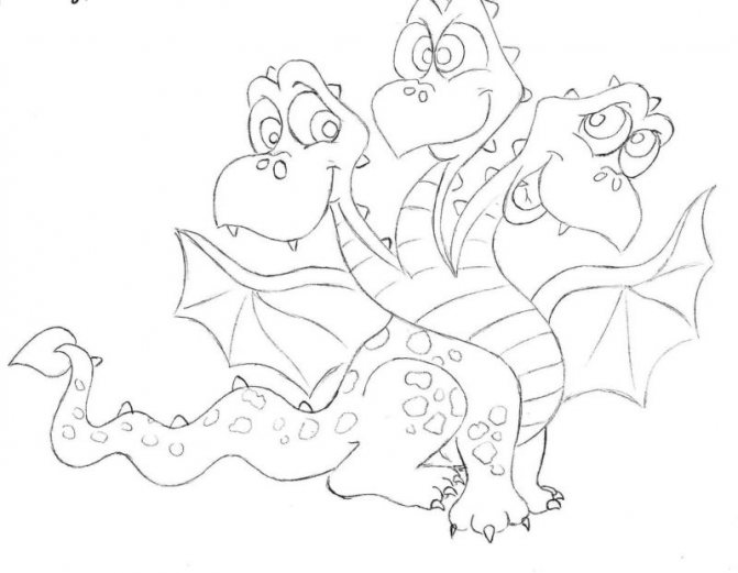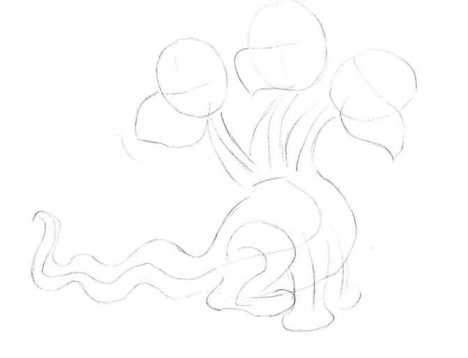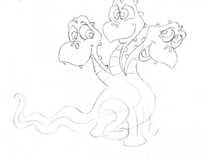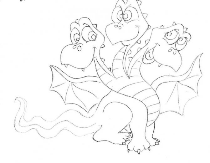 - Commencez par une esquisse. Dessinez trois cercles à une certaine distance les uns des autres. Ce sont les futures têtes de notre dragon. De chaque cercle vers le bas, tracez la ligne - le cou, sous eux dessinez un triangle aux bords arrondis - le corps, la ligne de la queue et des ovales pour les futures jambes.