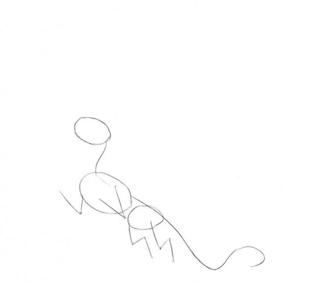 - Sous un petit cercle au loin, dessinez-en un autre, mais de plus grande taille. Ce sera le torse. Les ovales dessinent les pieds, finissent de dessiner la queue.
