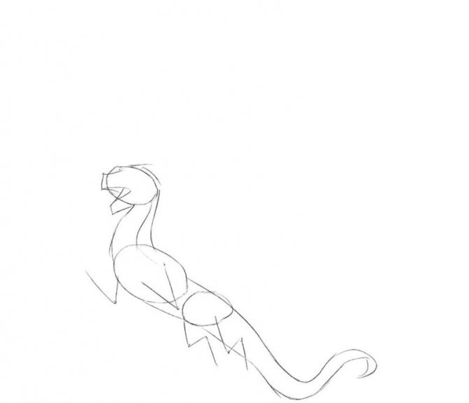 - Ensuite, relie deux cercles ensemble - ce sera le cou et le début du corps de notre dragon. Dessinez les pattes, elles sont pointues, comme un triangle. A l'intérieur, effacez tout ce qui n'est pas nécessaire.