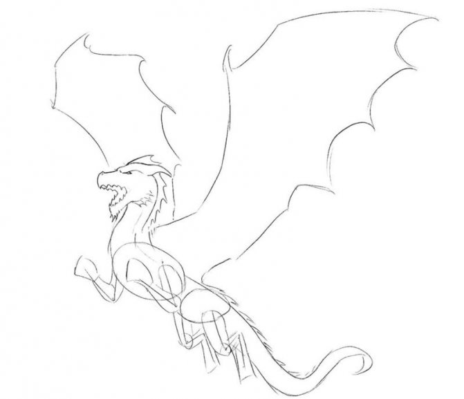 - Enfin, ajoutez des épines sur tout le corps du dragon, finissez de dessiner les ailes, marquez les éléments d'écailles, les griffes sur les pattes.