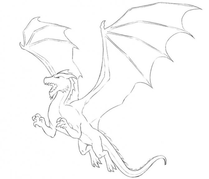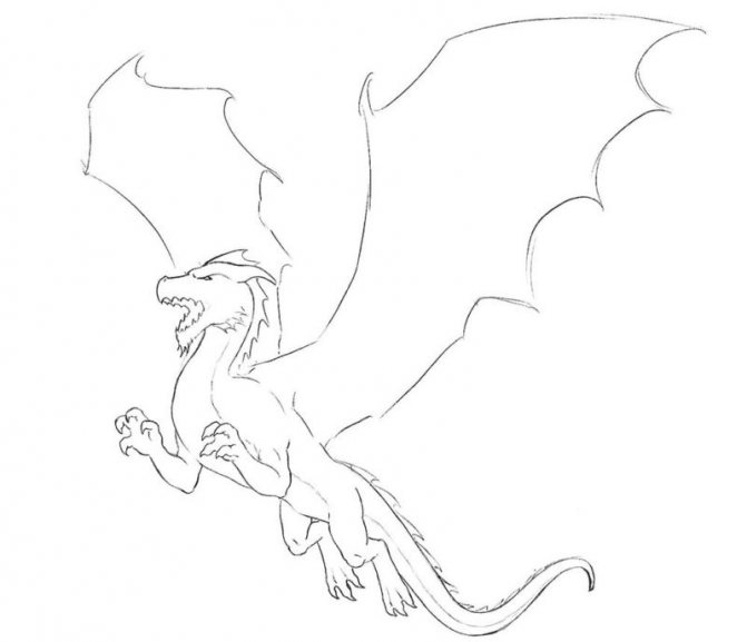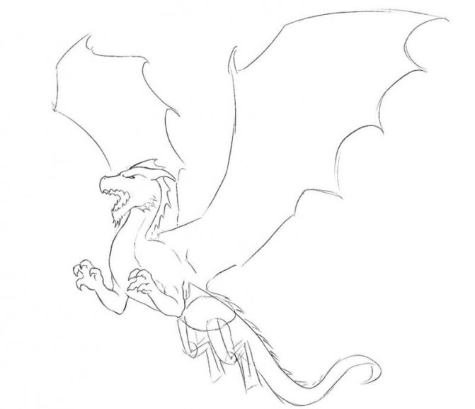 L'étape suivante consiste à dessiner les ailes. Vous pouvez ajouter des veines, des épines aux ailes. Dessinez des griffes sur les jambes, vous pouvez ajouter des éléments d'écailles dans différentes parties du corps. Dessinez des yeux, des narines pour le dragon à dessiner.
