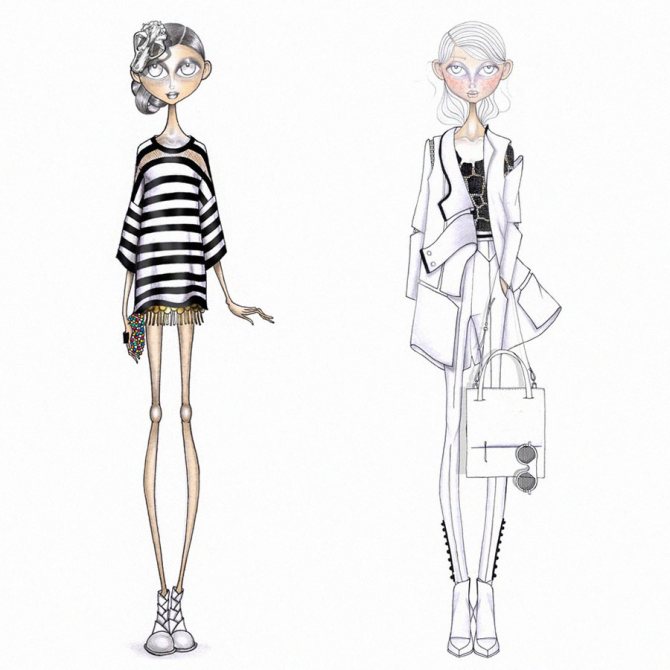 Cette illustration a un but purement esthétique, toute l'essence de la stylisation vise à créer un certain effet visuel de grande valeur décorative. Il peut s'agir d'illustrations publicitaires à fort contenu esthétique, où l'originalité et le talent prévalent au détriment d'un contour clair du vêtement. Le style décoratif peut également inclure la tendance à transformer le modèle en "poupée". Les personnages stylisés, généralement dotés de grands yeux et d'une grosse tête, rappellent tellement ce jouet.