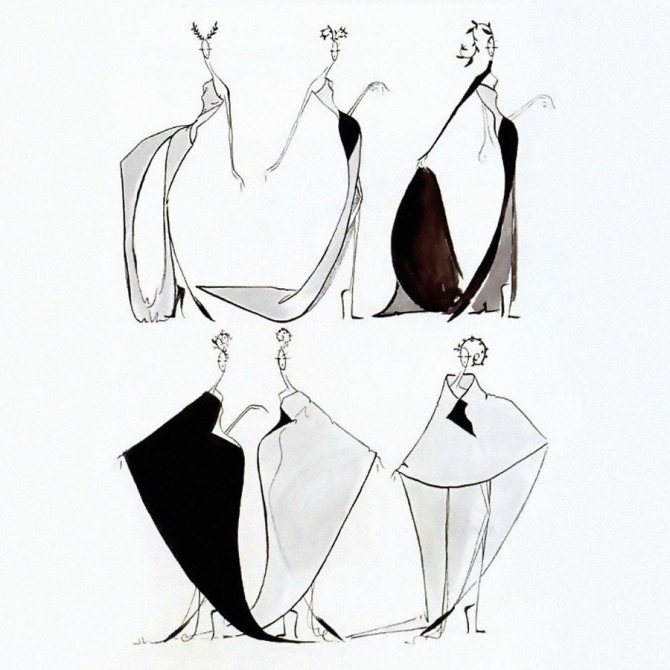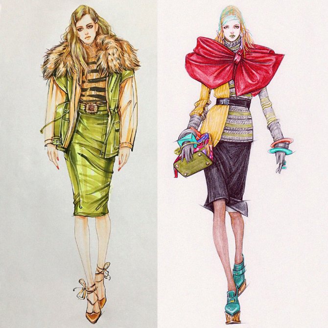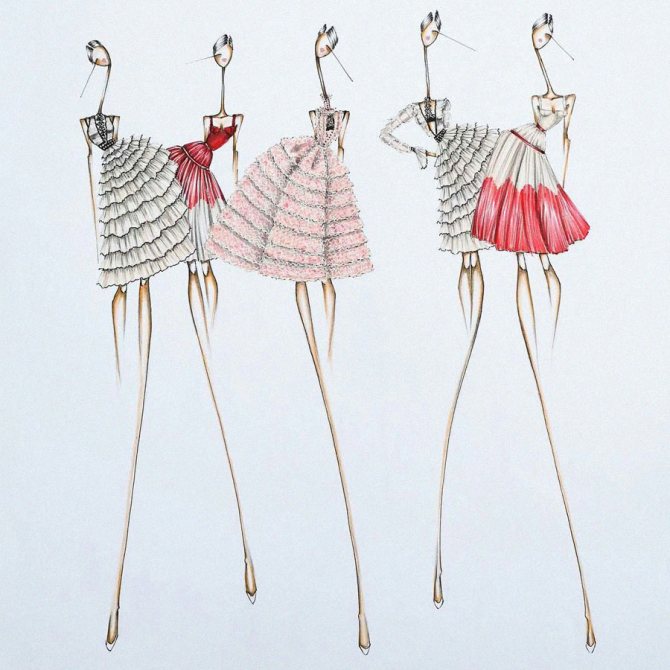 Ensuite, les auteurs sont analysés et sélectionnés pour un travail ultérieur - la création de croquis artistiques. croquis d'artLes croquis de conception montrent la forme du modèle et le matériau que le concepteur prévoit d'utiliser. Les esquisses artistiques montrent sur la figure humaine la forme du modèle et le matériau que le designer prévoit d'utiliser. Cette esquisse fournit des informations complètes sur la silhouette du modèle, sa plasticité, la nature des lignes de forme, la couleur, la décoration et la finition.