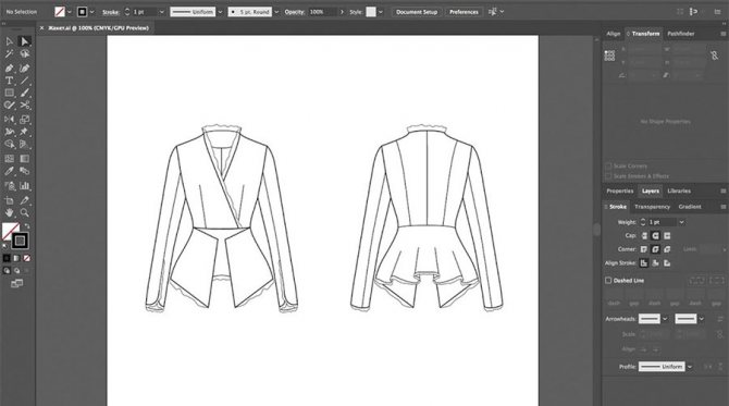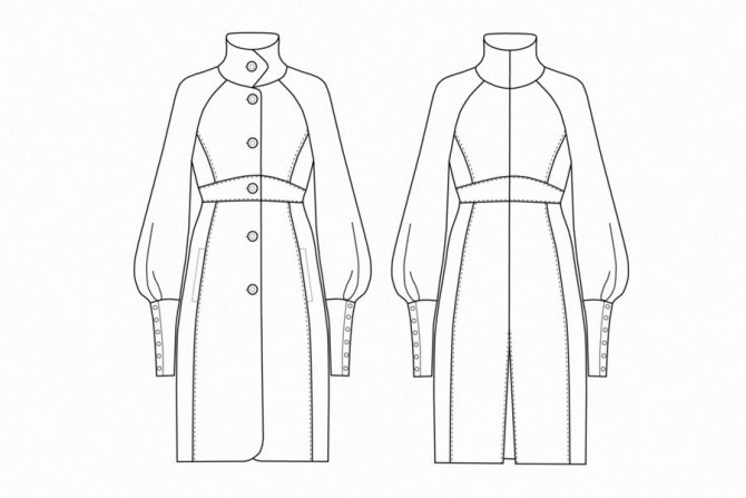 Les esquisses sont ensuite traduites en techniqueLes esquisses techniques sont ensuite transformées en croquis techniques et utilisées pour créer des modèles. Le croquis technique est créé à l'aide de lignes de base - axe médian, base du cou, poitrine, taille, hanches. Le croquis technique doit être parfaitement exact et schématique, montrant les lignes de contour du motif et la présence de coutures décoratives, de garnitures, de poches et d'autres détails. Pour montrer les caractéristiques de conception du modèle, celui-ci est présenté sous différents angles : de face, de dos et parfois de côté. Si nécessaire, on peut montrer l'envers du décor. Si certains détails sont inhabituels en termes de configuration, de finition ou de fabrication, ils sont présentés séparément, avec un zoom avant et arrière par rapport à la ligne de la silhouette du modèle. Les dessins techniques peuvent contenir des inserts de texte explicatif représentés par des notes de bas de page.