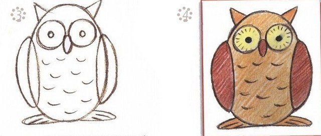 Mais dessiner une chouette peut être un peu plus facile. Pour ce faire, regardez les dessins étape par étape, et essayez de faire la même chose vous-même.