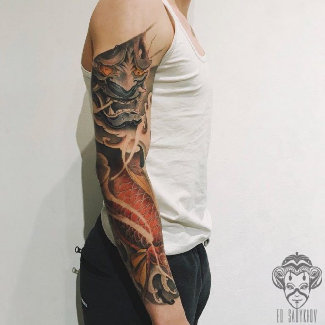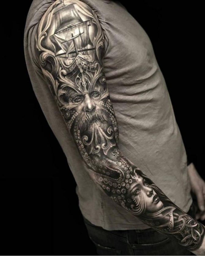 Le tatouage "manche" masculin est un genre indépendant qui a absorbé tout ce qu'il y a de mieux dans l'art du tatouage. Un tel tatouage attire instantanément l'attention de tout le monde, suscitant un intérêt actif. Bien que les femmes soient également tatouées sur la "manche" du bras, les sujets masculins ne doivent pas être confondus avec autre chose. Ce type de tatouage sur le bras d'un homme ressemble à une composition riche et complète dans un ou plusieurs styles harmonieusement assortis.