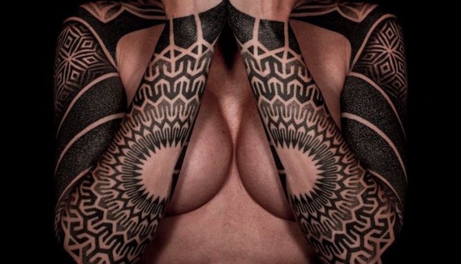Le blackwork est un genre de performance de tatouage où l'image est l'avantage d'une couleur noire avec une couverture maximale de la zone du bras. Cela n'affecte cependant pas l'art corporel et les motifs. Il existe des variantes où vous remplissez simplement une partie du corps de noir, ce qui semble assez brutal. Le Chicano est le choix parfait pour un tatouage noir unique sur votre bras. À première vue, le sujet du tatouage peut sembler un peu sombre, mais si vous regardez de près, vous pouvez voir le sens profond de l'image, un reflet des attitudes de vie et des valeurs morales. Ils représentent souvent le visage d'une fille, ainsi que des crânes, des croix, des visages de célébrités, des phrases et des slogans, et des thèmes bibliques.