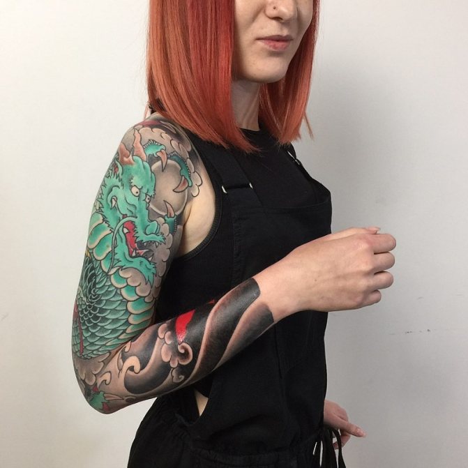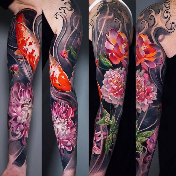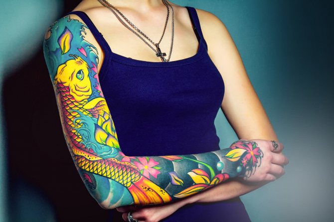 Le style du tatouage en manche détermine également sa signification esthétique. Il existe des dizaines de genres de magnifiques tatouages en couleur pour les hommes et les femmes sur l'ensemble du bras. La technique principale du tatouage à pois de couleur trash est la provocation. Sur les images de ce type, vous verrez le plus souvent de l'ironie, du sarcasme, voire des blasphèmes. La polka de Thresh combine un beau regard de dessin et un regard déchirant de mort et d'horreur. Un motif plus grand est plus intéressant car il peut exprimer la signification unique du tatouage. Le style réaliste est considéré comme le plus difficile à exécuter dans un tatouage de bras coloré, mais il est recherché et à la mode. Une image sur le bras de ce type implique une exécution à grande échelle du dessin, produit le plus souvent une combinaison de portraits, une partie de la nature ou de l'architecture ou un motif du monde de la fantaisie. L'art corporel à l'ancienne prime avec des couleurs vives et des lignes fines qui lui donnent un aspect net et volumineux. On y trouve souvent des images de visages, de sirènes, de bateaux, de roses des vents, parfois ce sont des papillons et des animaux au caractère agressif, comme un tigre, un jaguar.