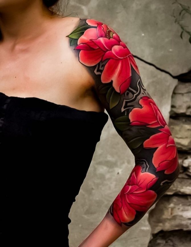 Dans un tatouage de manche, comme dans d'autres, on peut considérer le caractère et l'état d'esprit intérieur d'une personne. Par exemple, de nombreux dessins représentent des fleurs. Si nous voyons une bruyère, cela évoque le désir d'une personne de guérir ses blessures mentales. La rose classique est un symbole de grand amour et de passion. Un lys peut être vu sur le corps d'une personne ayant une haute opinion d'elle-même. Ivy indique que le porteur est dépendant des circonstances ou des sentiments.