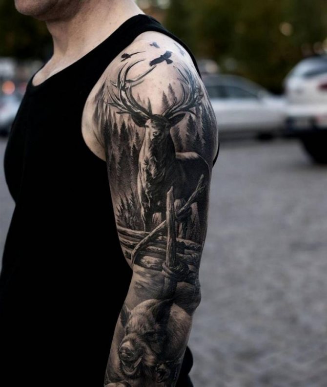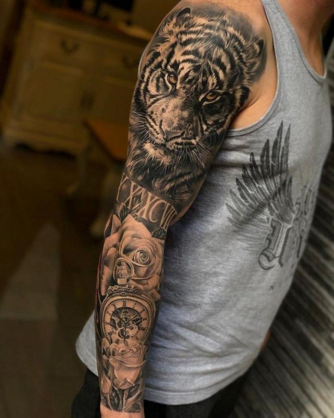 La structure du tatouage peut couvrir la moitié, un tiers ou un quart du bras. La partie sélectionnée à tatouer est entièrement peinte, en combinant plusieurs couleurs et des dizaines d'éléments. Dans un tatouage jusqu'au coude, une représentation du monde animal exprime la loyauté, le courage, la bravoure. Et l'image d'un artiste de rock communiquera une attitude envers la créativité et un lien possible avec la musique.
