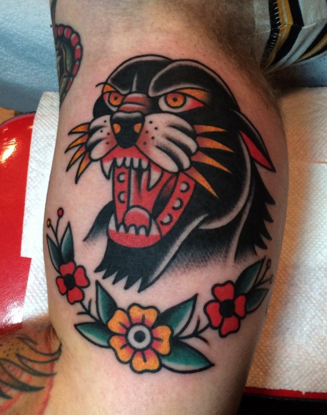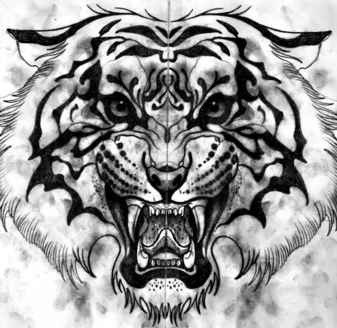 Alors que le tatouage calme a un aspect léger en termes de signification, une certaine origine divine, le tigre grimaçant est sans équivoque toutes les manifestations animales. C'est le pouvoir du côté obscur de l'homme - son subconscient. C'est dans le subconscient que s'engendrent les sentiments instinctifs des animaux - colère, rage, agressivité, désir de domination -.