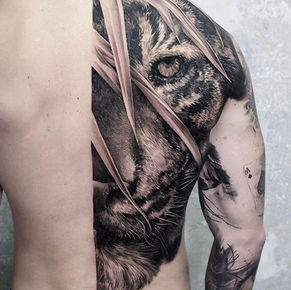 Si le tatouage du tigre comporte des éléments supplémentaires (feuilles, herbes, forêt, montagnes), il s'agit plus souvent d'une composition colorée. Une solution intéressante se trouve dans le style des gravures japonaises, où les œuvres de célèbres artistes japonais, Hiroshige et autres, sont souvent copiées.