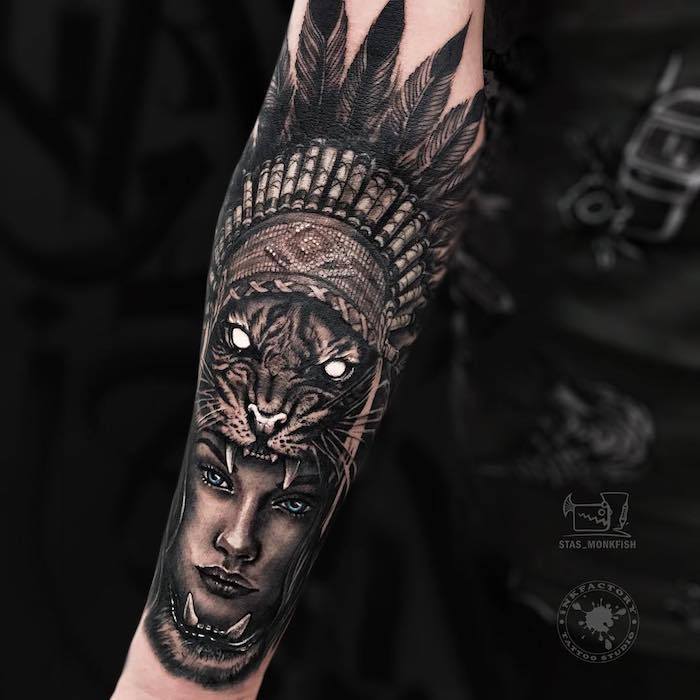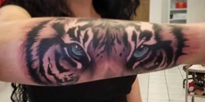 Les yeux du tigre. Tatouage sur l'avant-bras d'une fille