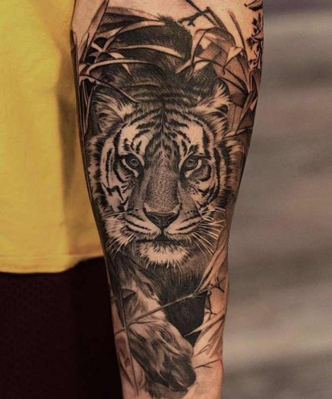 Le plus souvent, le tatouage avec un prédateur rayé est réalisé dans des tons noirs et blancs, mais les connaisseurs de tatouages colorés choisissent un schéma de couleurs réaliste de l'animal. Un animal monochrome aux yeux de couleurs vives sera du plus bel effet.