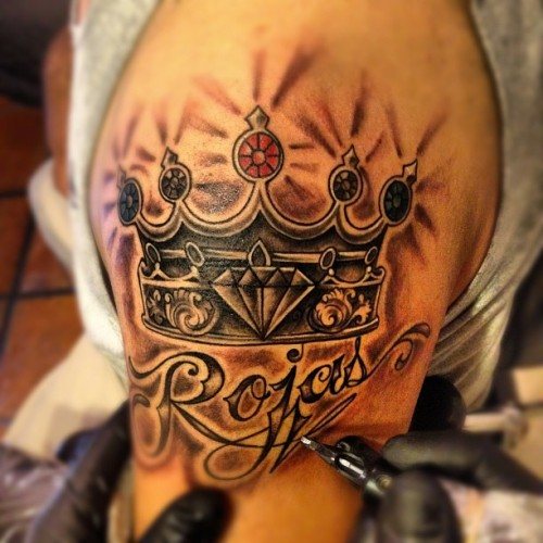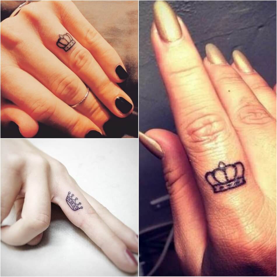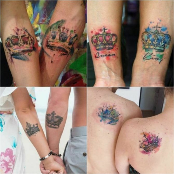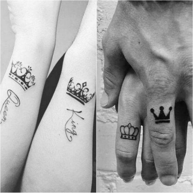 Tatouages pour couples Avec la couronne sont faites par des personnes qui veulent montrer à leur âme sœur qu'elles sont vraiment le numéro un, le plus important et le plus aimé. Les tatouages sont souvent accompagnés d'inscriptions avec des noms, des dates de mariage ou de rencontre.