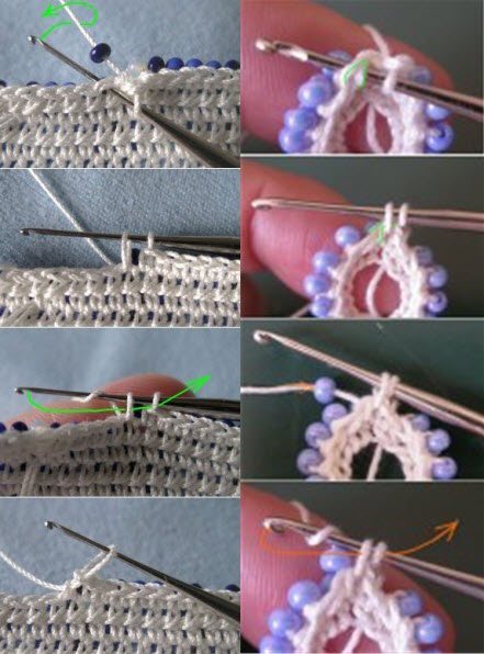 Les perles, si vous tricotez le long du bord, sont une autre option, mettez-les sur une boucle, si vous les voulez sur le dessus de la pièce, il est préférable de les enfiler avant de tricoter et de les tricoter à travers une maille, ainsi toutes les perles iront sur le dessus. Avec la colonne sans maille, nous montrons 2 méthodes de tricotage sur la photo.1 est la variante dans l'internet en langue russe, et 2 est la variante en langue anglaise.